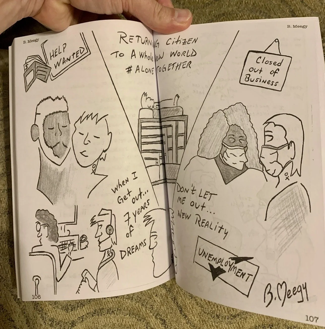 During the beginning months of Covid-19, ABO Comix put out a call for work based on our experience and feelings about the fear of Covid and being incarcerated. My schedule release was May of 2020, my feelings were will I as a person living with HIV survive these last months incarcerated. If I do, what will life be like when I get home, what will become of my many years of dreams, over seven years, of what life after incarceration would be.